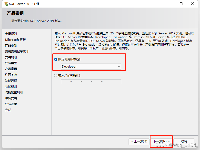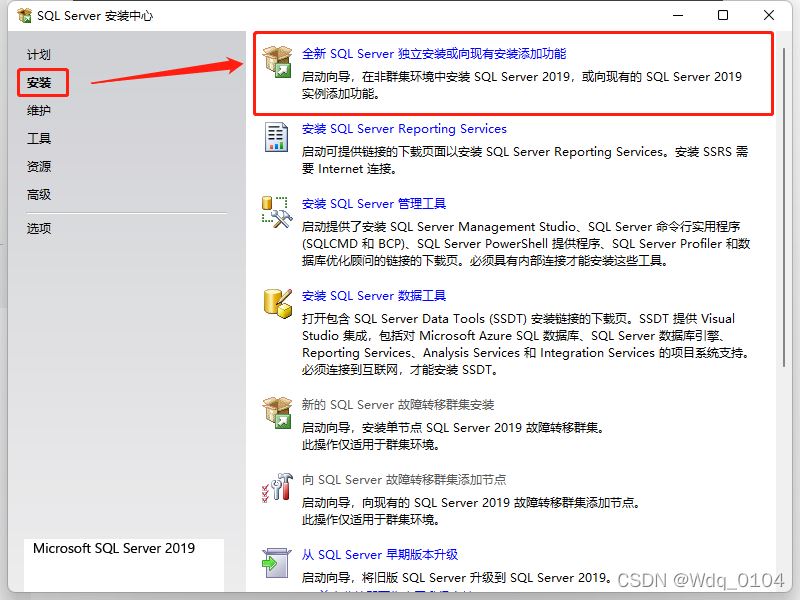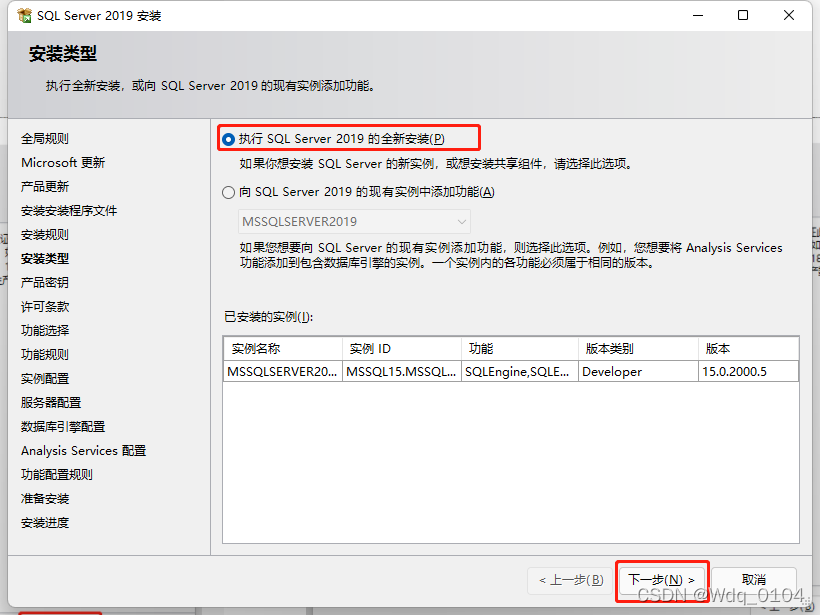選擇“執(zhí)行SQL Server 2019 的全新安裝”,點(diǎn)擊“下一步”。